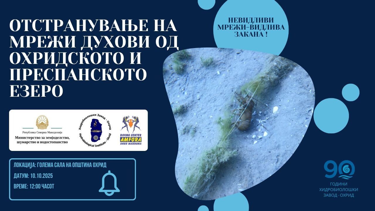 ЈНУ Хидробиолошки завод – Охрид на 10 октомври ќе одржи работилницата за подигнување на јавната свест: „Нeвидливи мрежи-видлива закана!“, посветена на запознавање на пошироката јавност со реализираните активности за отстранување на напуштен, изгубен, заборавен или на друг начин оставен рибарски алат – таканаречени „мрежи духови“ – од Охридското и Преспанското Езеро.