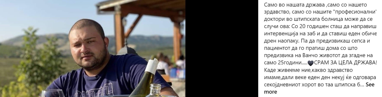 „Само во нашата држава, само со нашето здравство, само со нашите „професионални“ доктори во штипската болница може да се случи ова: Со 20-годишен стаж да направиш интервенција на заб и да ставиш еден обичен дрен наопаку. Па, да предизвикаш сепса и пациентот да го пратиш дома со што предизвика на Ванчо животот да згасне на само 25 години… СРАМ ЗА ЦЕЛА ДРЖАВА!!! Каде живееме ние, какво здравство имаме, дали веќе еден ден некој ќе одговара за секојдневниот хорор во таа штипска болница. Колку животи згаснаа само поради невнимание. До кога нашиот народ ќе се лекува само со „како е рекол Бог“…. Дали во 21 век треба да се случи таков срам? Ангелу наш ти почивај во мир. А тие нема да спијат мирно“, се вели во една од објавите посветени на прерано починатиот Јован.