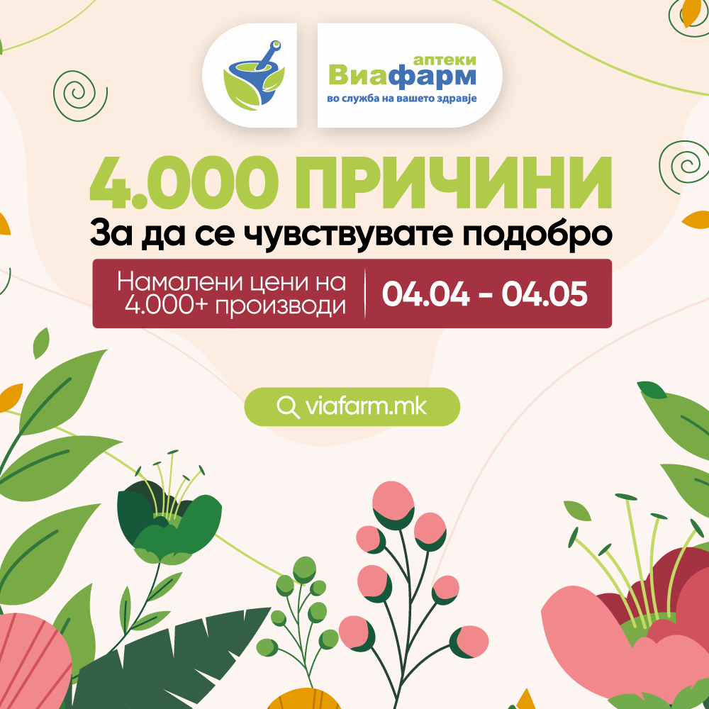 Од 4 април до 4 мај, во сите аптеки на „Виа Фарм“ започнува акција со намалени цени на над 4.000 производи – витамини за повеќе енергија, суплементи за секојдневна поддршка, бебешка храна за најмалите, козметика за нега и убавина и уште многу други производи што се дел од вашето секојдневие.