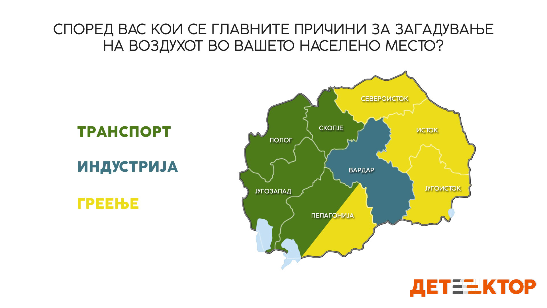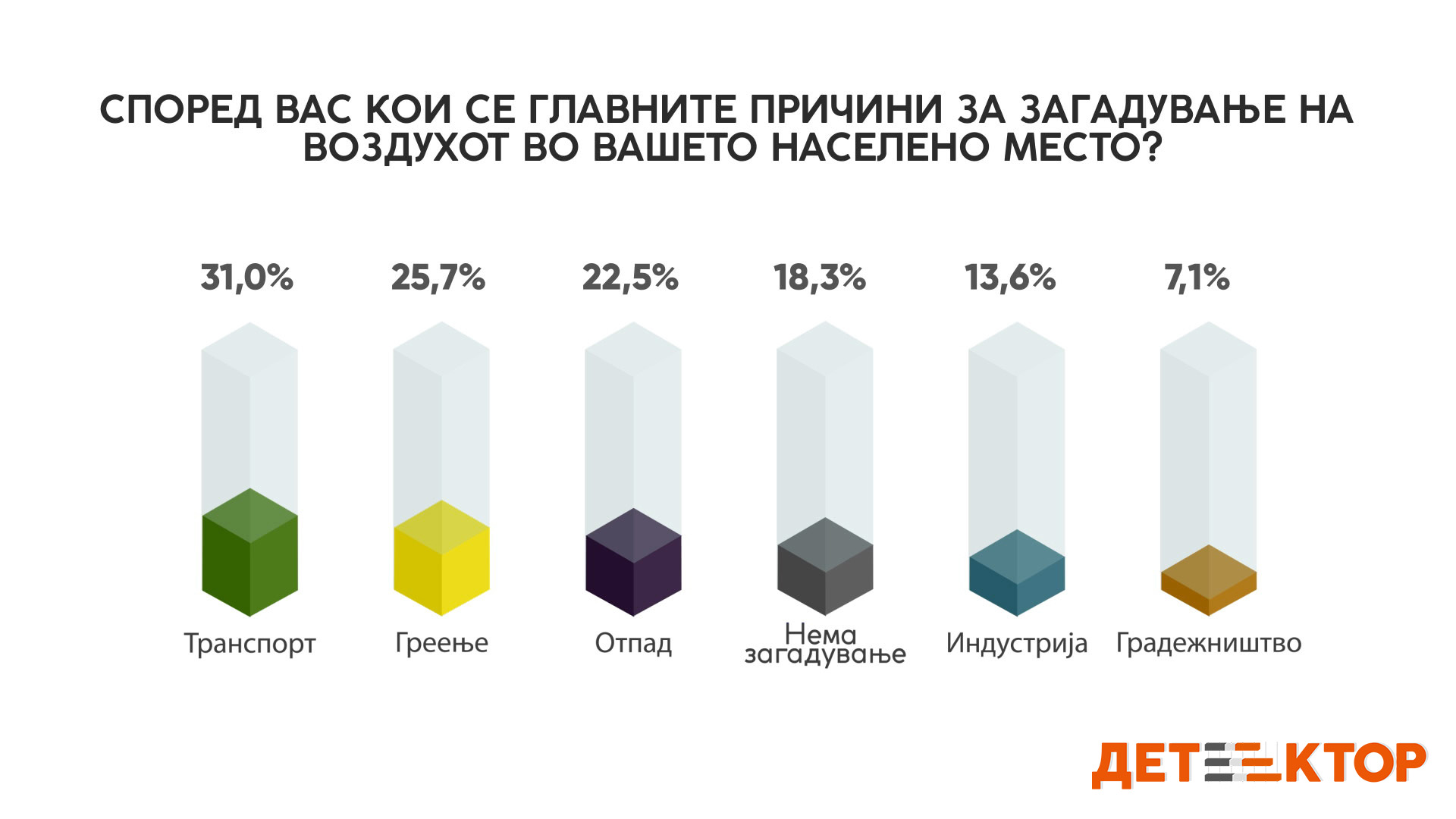 Според истражувањето, граѓаните сметаат дека транспортот, греењето и отпадот се водечки причинители на загадувањето, а потоа следуваат индустријата и градежништвото. Мнозинството од граѓаните (58,7%) сметаат и дека земјава нема соодветен пристап за справување со загадувањето на воздухот како и дека квалитетот на воздухот оваа година останува сосема ист споредено со минатата (51,7 %).