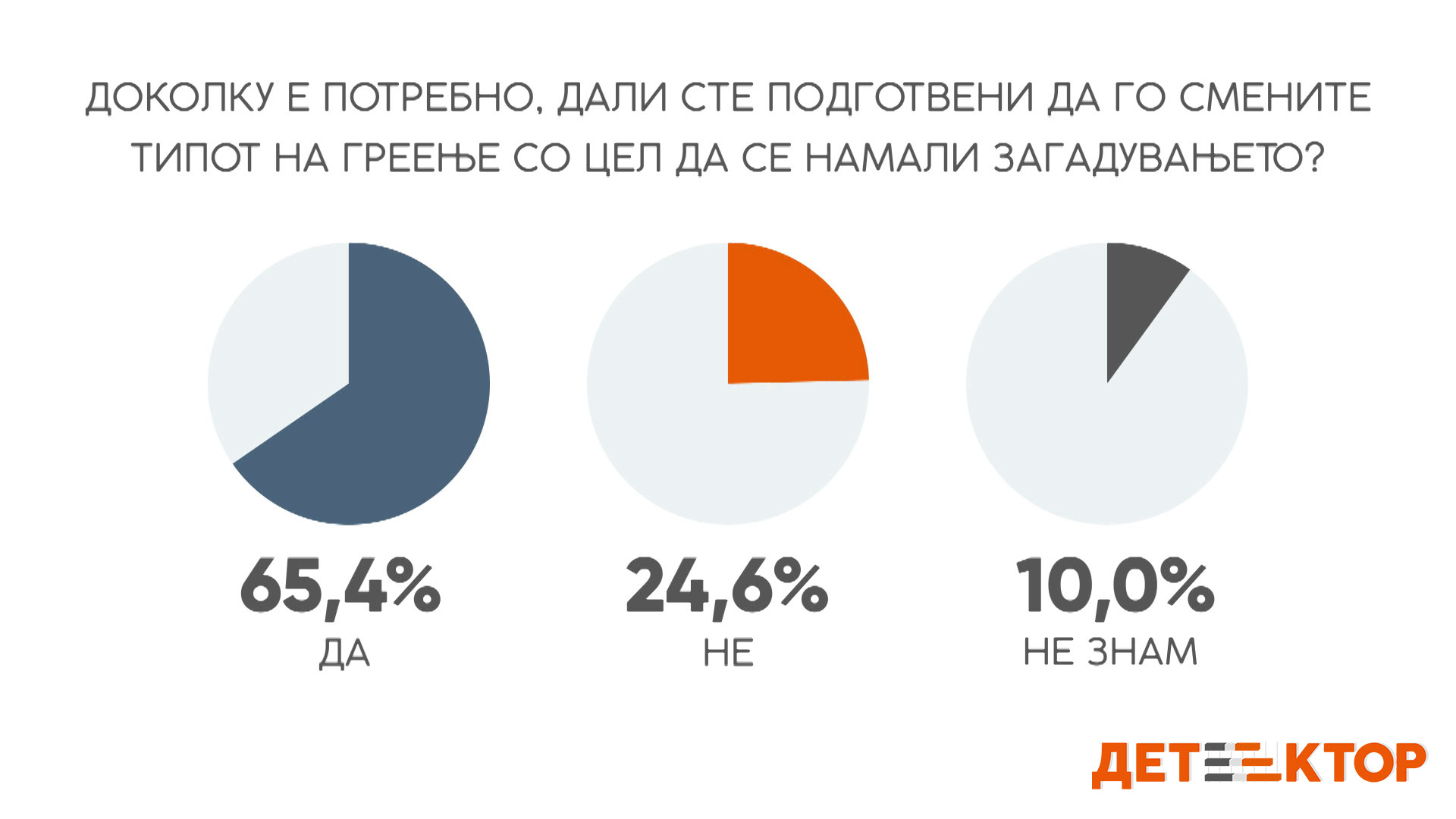 Греењето како водечки причинител за загадувањето мотивира 65,4% од граѓаните да го променат типот на греење со цел тоа да се намали, a осум од десет граѓани, очекуваат дека државата треба да обезбеди субвенции за еколошко затоплување и да воведе и еколошки такси за греење кое го загадува воздухот.