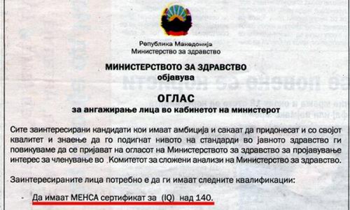 Инаку, ова е прв пат во земјава да се постави ваков несекојдневен услов за лицата кои аплицираат за работа, во случајов коефициентот на интелегенција.