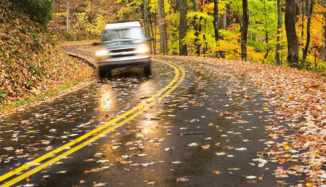 Не сопирајте на лисја. Влажните лисја можат да бидат лизгави како мраз. Возете полека низ нив и избегнувајте нагло сопирање. Лисјата може да ги покријат линиите и другата хоризонтална сигнализација на патот, па обрнете внимание на рабовите од коловозот и внимавајте да останете во вашата лента.
