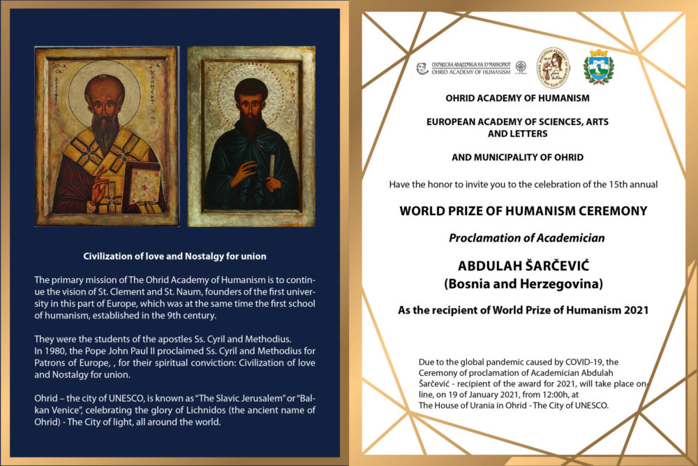 Церемонијата на прогласување на академик Абдулах Шарчевиќ – добитник на Светската награда на хуманизмот, за 2021 година, ќе се одржи преку Интернет, на 19 јануари 2021 година, од своето традиционално место, Куќата на Уранија (Македонска академија на науките и уметностите) во Охрид – градот на УНЕСКО.