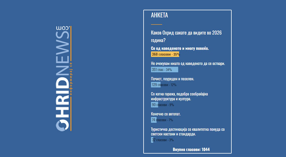 Едно е сигурно, охриѓани сакаат почист, поуреден и позелен град, со изградена катна гаража, подобра сообраќајна инфраструктура и култура, туристичка дестинација со квалитетна понуда со светски настани и стандарди и, конечно автопатски поврзан. Ова го покажува анкетата што ја спроведе Охридњуз во која мнозинството граѓани посакуваат да се оствари се од наведеното. Но, голем дел од нив – 34 отсто, се скептици дека тоа целосно и ќе се оствари. Во анкетата учествуваа 1044 читатели.