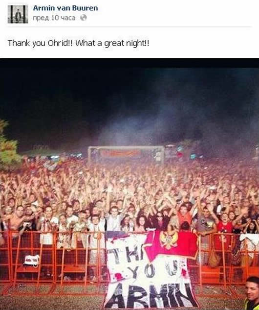 Еден од најдобрите светски диџеи, Armin van Buuren, имаше извонреден настап на Green beach фестивалот на плажата Парк во Охрид, каде синоќа околу десет илјади фанови се забавуваа до раните утрински часови. Според присутните синоќешниот настап на van Buren бил спектакуларен, а силни впечатоци од Охрид со себе понесе и холандскиот диџеј, кој на својата фан страна на Facebook и се заблагодари на публиката за прекрасната ноќ во Охрид.