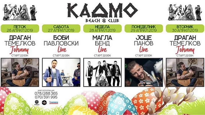 Во „Кадмо“ бар, за забавата на Велики Петок задолжени се уникатните шоумени „Броз“. Во сабота гостува дуото „Рандевоус“, недела е резервирана за Велигденска забава со „Балкан џем“, а понеделник настапува диџеј Гец.