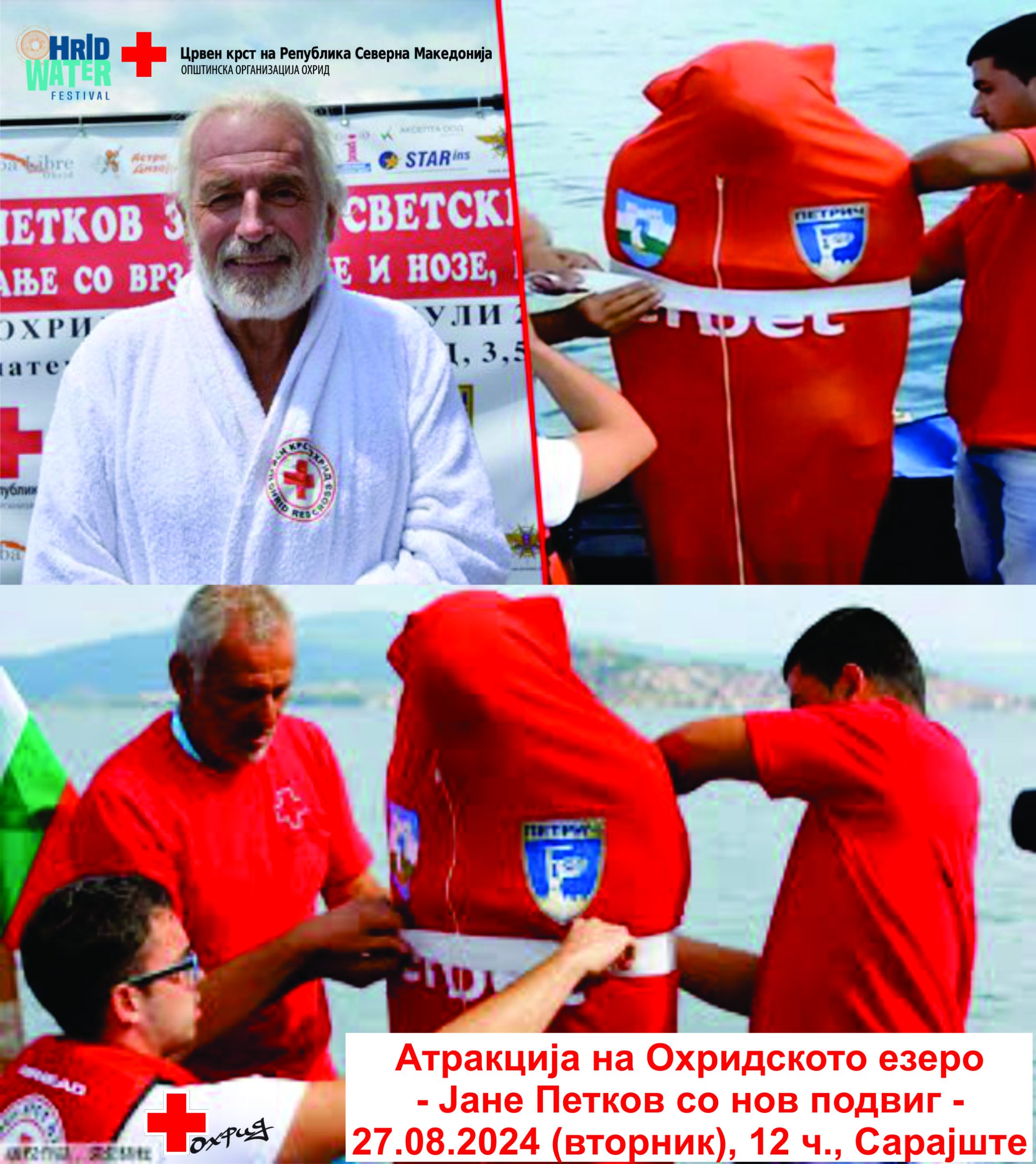 Човекот амфибија, седумдесетгодишниот Јане Петков, во многу сложени услови, врзан со лисици, ланци и катинари, потопен на дното на Охридското Езеро, кај плажата Сараиште ќе се обиде да се ослободи и излезе на површината на водата, без никакви помагала, по примерот на светски познатиот илузионист Harry Houdini, посочуваат од Црвен крст Охрид.