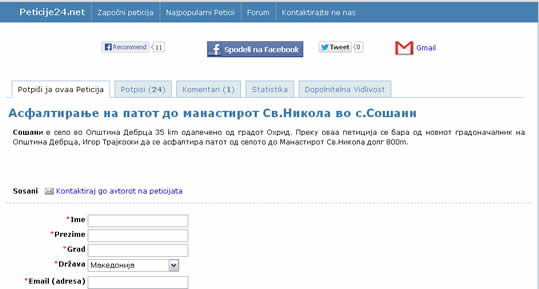 Жителите на селото Сошани, општина Дебрца, покренаа онлајн петиција за подобрување на патната инфраструктура. Тие од новиот градоначалник бараат да го асфалтира патот од селото до манастирот Свети Никола.