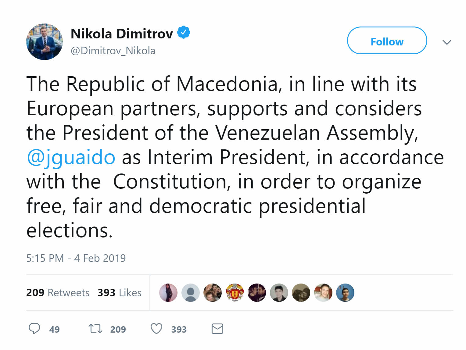 Министерот за надворешни работи Никола Димитров, на својот твитер профил се огласи по повод случувањата во Венецуела. Тој напиша дека Македонија во координација со европските партнери го поддржува Хуан Гуаидо, опозицискиот лидер кој неодамна се прогласи за времен претседател на државата.