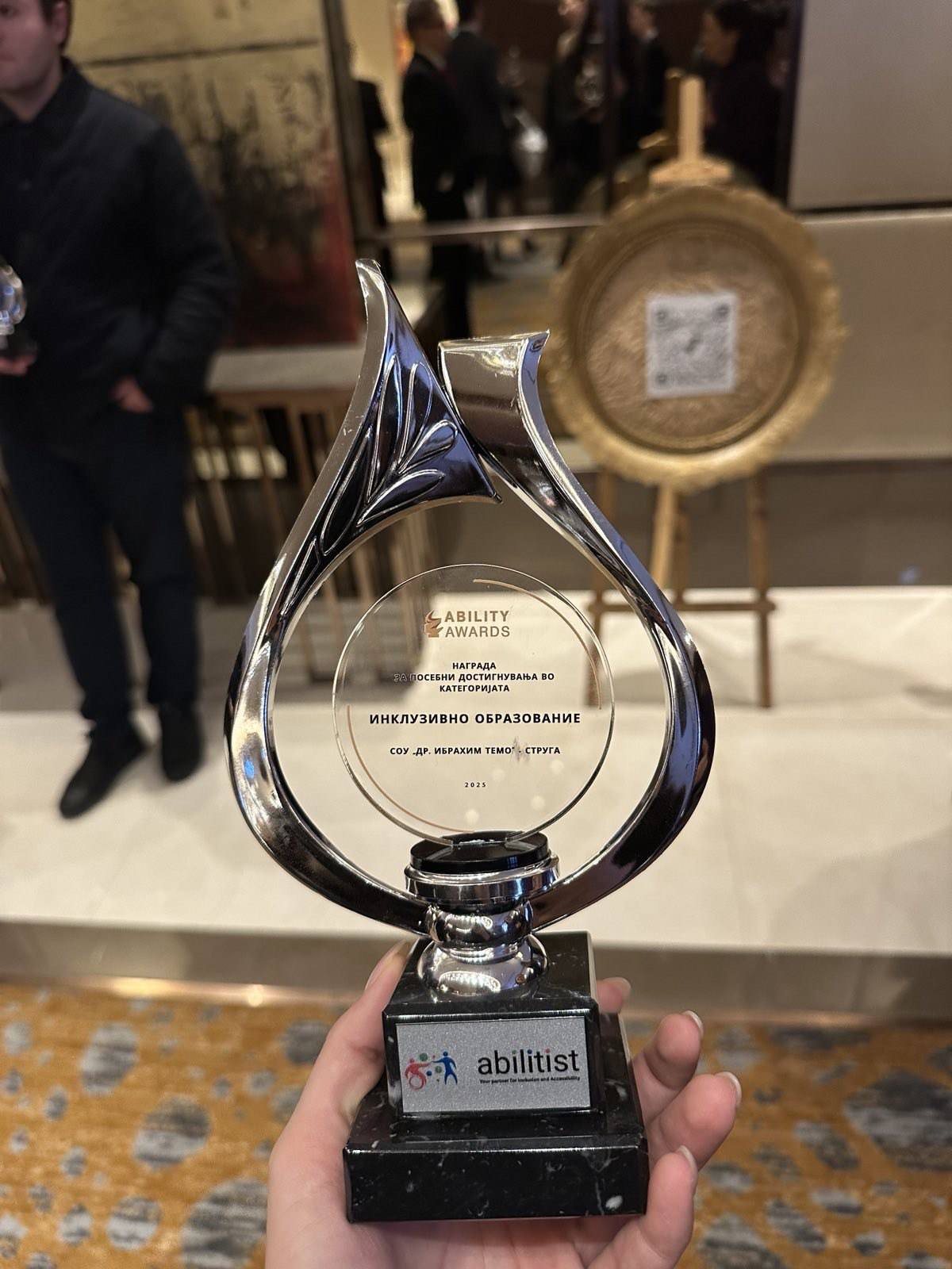 На Меѓународниот ден на лицата со попреченост директорката на СОУ Гимназија „Д-р Ибрахим Темо” Струга, Бесиме Јонузи, наградена за посебни достигнувања во инклузивното образование на настанот „Ability Awards 2025“ кој има за цел да ја промовира инклузијата и да поттикне создавање еднакви можности за сите граѓани.