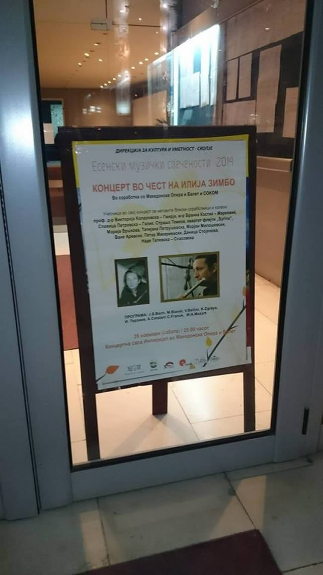 Во преполната Империјал сала на Македонската опера и балет, семејството, колегите, почитувачите и пријателите на флејтистот Илија Зимбо се потсетија на неговиот музички опус од најраните години кога како млад генијален уметник ги освојуваше првите места на тогашните сојузни натпревари, преку образованието во Скопје и Љубљана, соработката со врвни педагози и познати европски менаџерски куќи, музицирањето на познати сцени, меѓународни фестивали и престижни натпревари, на кои имаше забележителни изведби и освоени награди. Зимбо, кој беше прв флејтист во Македонската опера и балет, беше предизвик за истакнатите македонски композитори да создадат дела тому за него.