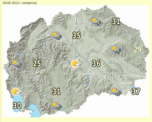 Во Македонија денеска ќе преовладува сончево време со умерена облачност и со слаб до умерен северен ветер. Попладне ќе биде нестабилно облачно со локален пороен дожд и грмежи, на места во форма на невреме со засилен ветер и град.