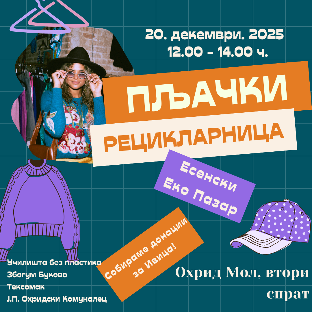Четвртиот по ред еко пазар на „Училиштата без пластика” ќе се одржи утре, 20-ти декември од 12.00 часот во Охрид Мол. Пазарот на облека, обувки, книги и други предмети на втора рака е дел од напорите на програмата за подигање на свеста за опасностите од текстилниот отпад и негативните ефекти врз здравјето на луѓето и животната средина на брзата мода, велат организаторите.