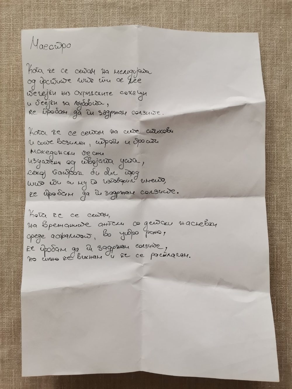 Иако не е меѓу нас знаеме дека ќе беше предводник на нашата генерација која ги прави промените, затоа што се’ уште не спојува неговата енергија, не инспирира. Затоа се што правиме го посветуваме нему, а се надеваме дека барем половина од неговите идеи ќе успееме да ги реализираме. – истакна Цветкоски, кој му посвети песна на маестро Андреј, како што го нарекува неговата генерација.