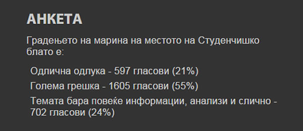 Градењето на марина во Студенчишко блато претставува голема грешка сметаат читателите на OhridNews. Дел од нив се на мислење дека темата бара повеќе информации и анализи, додека дел смета оти градењето на марина во Студенчишко блато е одлична одлука.