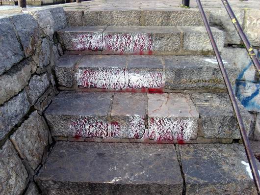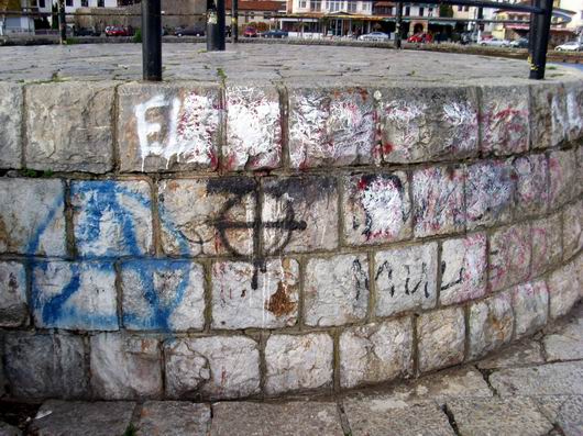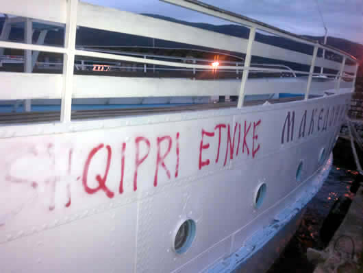 Националистичките пораки кои вчера можеа да се видат на светилникот и бродот „Македонија“ на градското пристаниште, попладнево беа избришани и премачкани со бела боја.