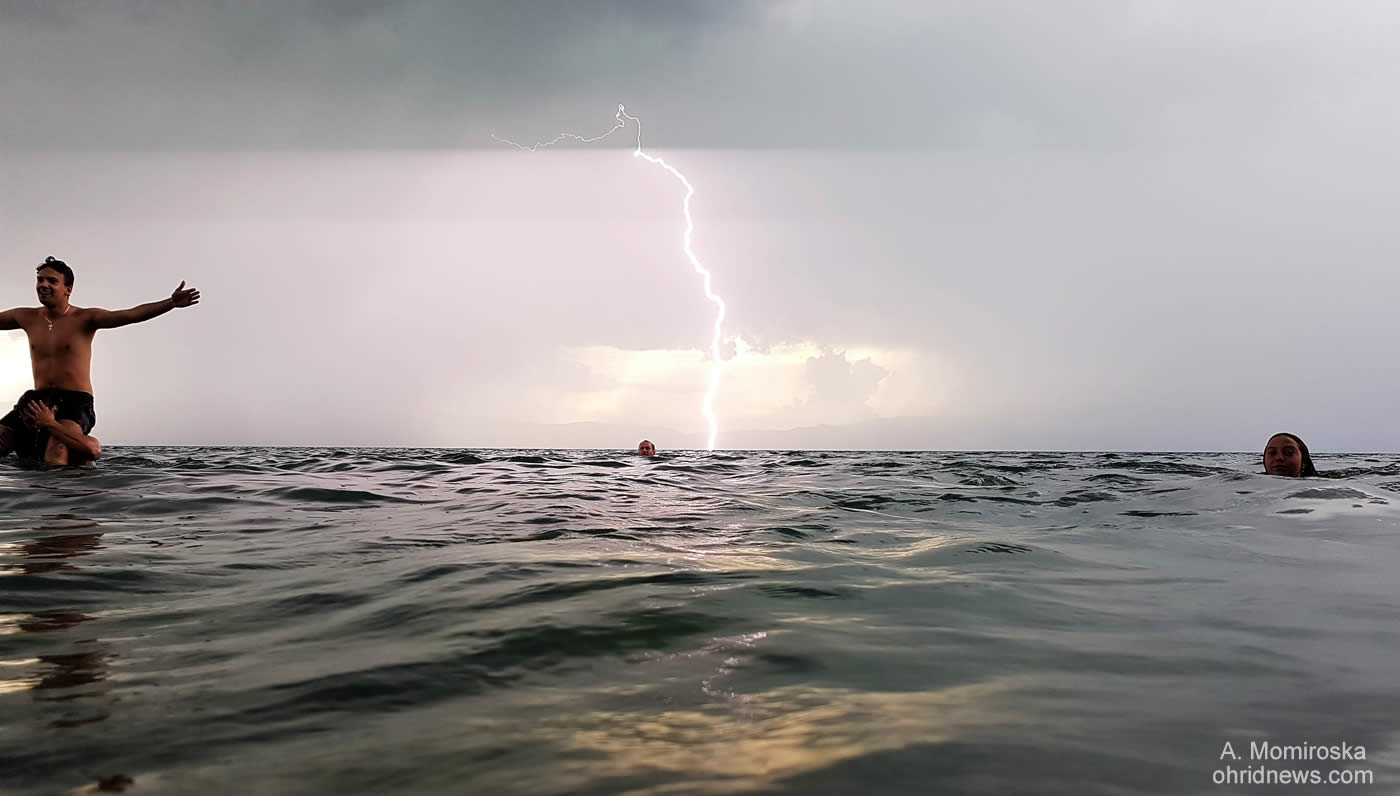 Попладнево делови од Охридскиот регион повторно ги зафати краткотрајно, но силно невреме, проследено со врнежи од дожд, ветер и грмотевици. За момент се спoија небото и земјата, а молњи удираа во Езерото. Еден таков момент „улови“ нашиот фотограф Анамарија Момироска.