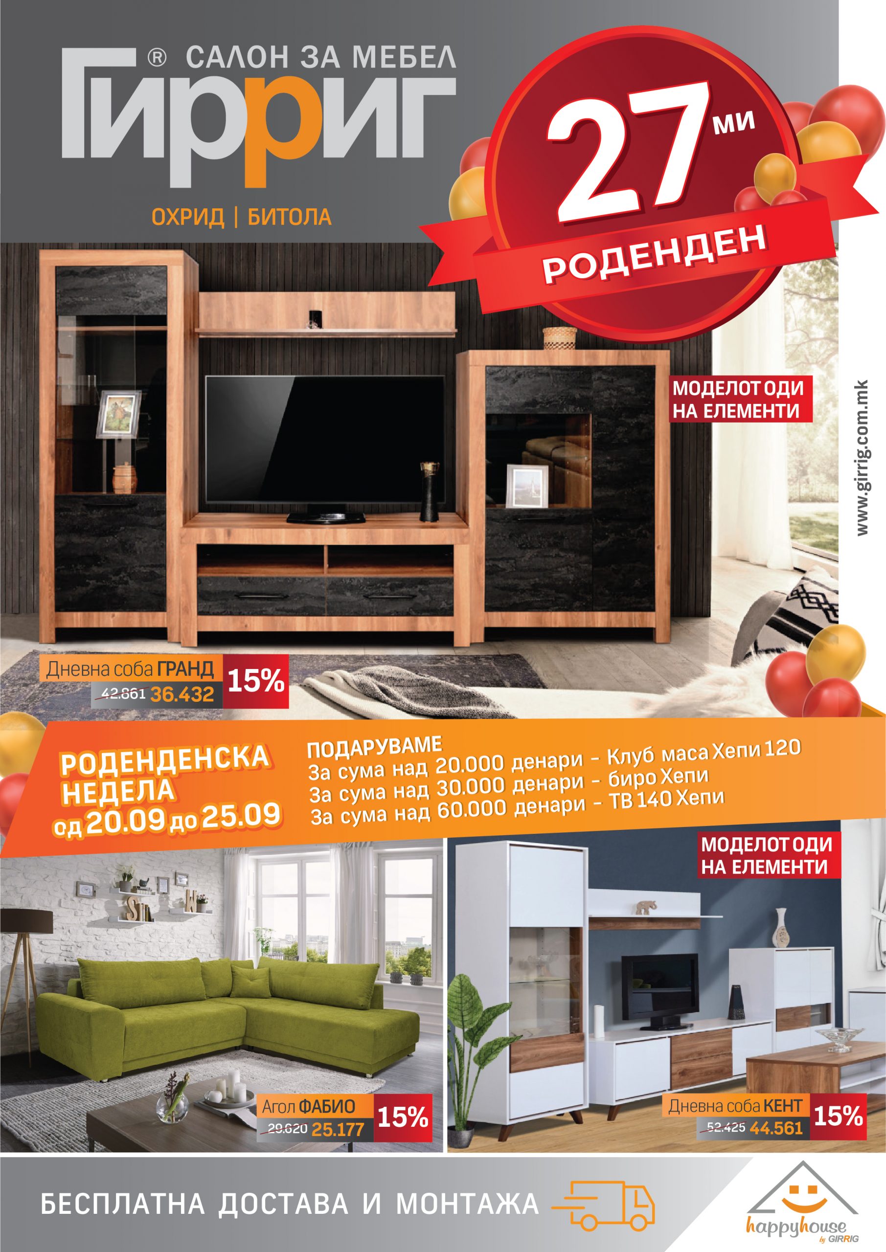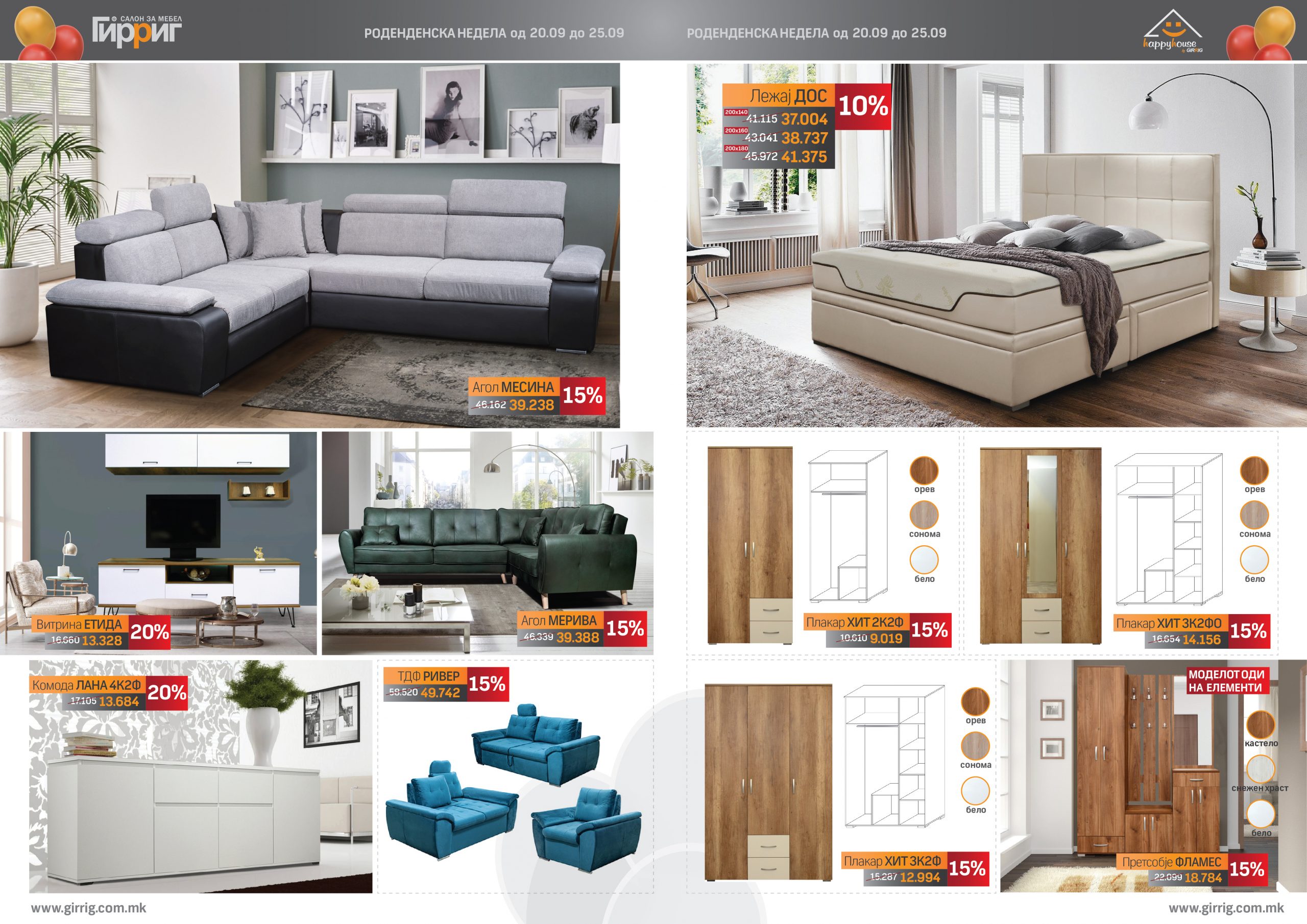 Во роденденската недела од 20.09 до 25.09 „Гирриг“ најавува големи попусти, подароци и се разбира, врвно изработен мебел по специјални цени.