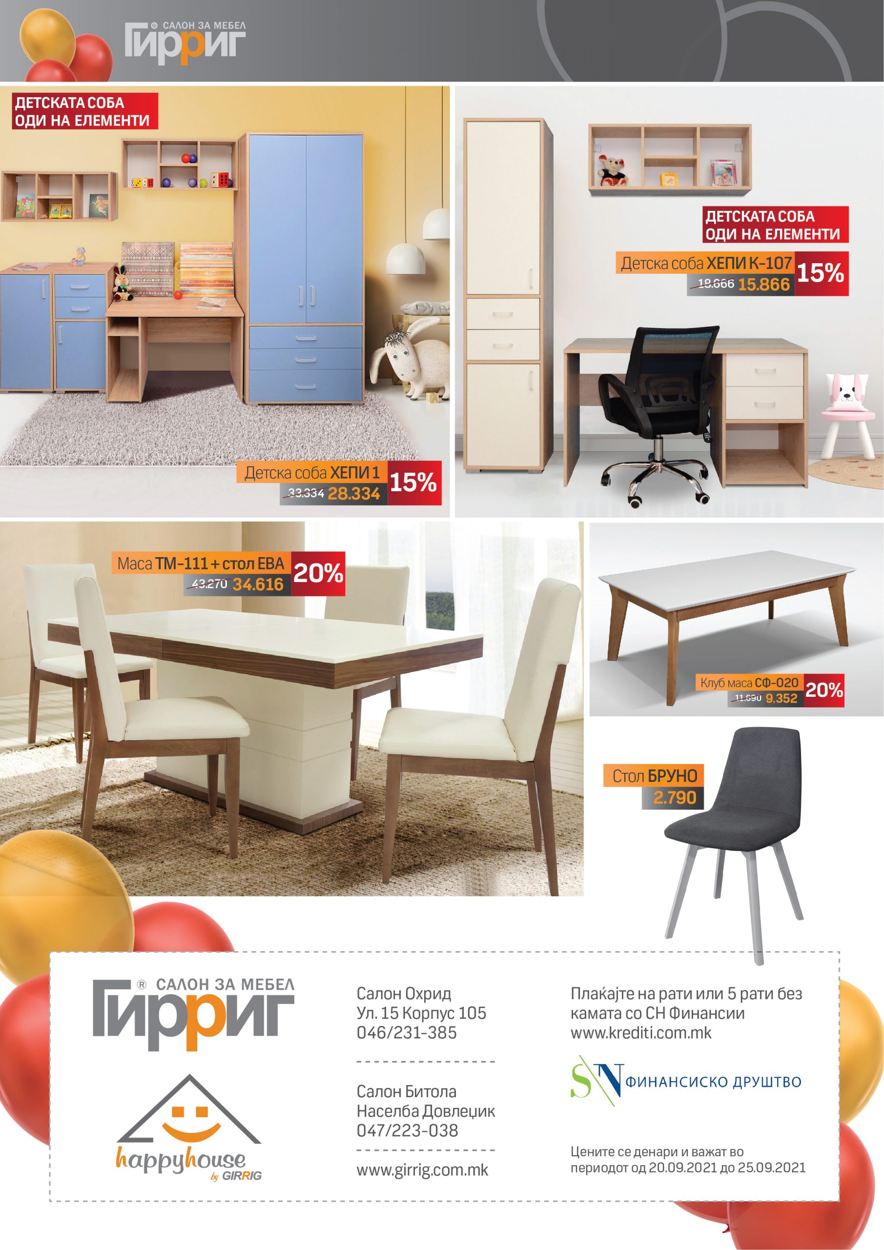 За купен мебел во износ над 20000 денари „Гирриг“ во роденденската недела подарува клуб маса Хепи, за сума над 40000 биро Хепи, а за сума над 60000 тв Хепи.