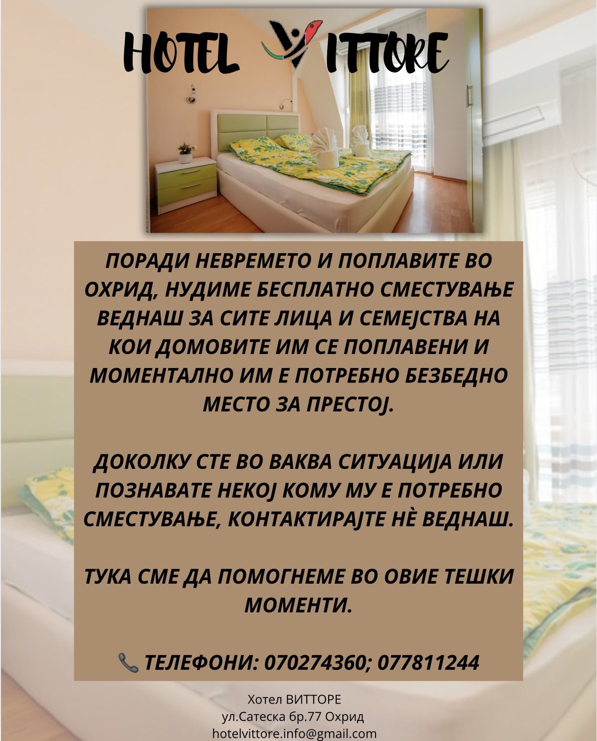 Доколку сте во ваква ситуација или познавате некој кому му е потребно сместување, контактирајте не веднаш. – стои во објавата на хотел „Виторе“.