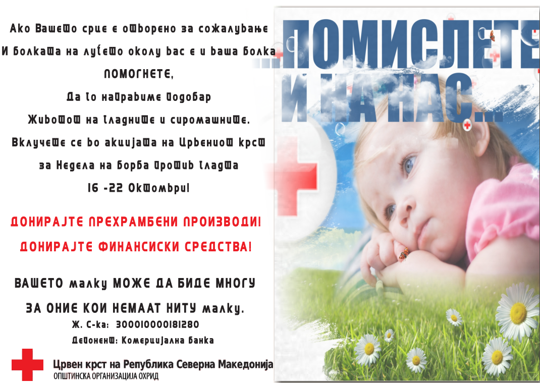 Оваа година Меѓународниот ден на борба против гладта 16 Октомври и Неделата на борба против гладта (16- 22 Октомври) ќе го одбележиме со активности насочени кон прибирање на доброволни прилози наменети за набавка на прехрамбени производи за подготовка на хуманитарни пакети за социјално најзагрозените семејства од Охрид и Дебрца. Во текот на Неделата на борба против гладта од 16-22 Октомври во поголемите градски маркети ќе бидат поставени пунктови на Црвен крст Охрид со видно обележени корпи во кои хуманите сограѓани ќе можат да стават-донираат основни прехрамбени производи, велат од организацијата.
