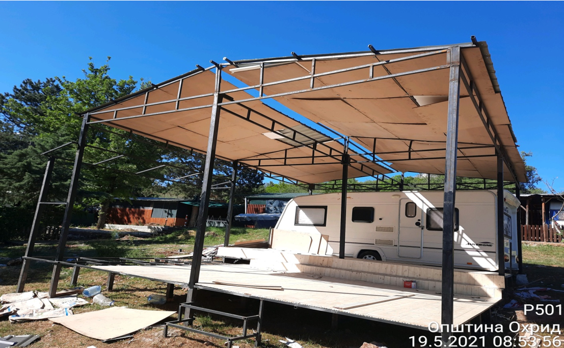 Извршен е комплетен надзор на 15 автокамп приколки, при што се затекнати бетонски подлоги, метални настрешници, целосно затворање на автокамп приколките со лим, дрво, алукобонд и водоотпорни гипс картон плочи. Затекнати се недозволени дрвени и метални конструкции и времени објекти. На одредени локации се затекнати и приклучоци за водоводна мрежа, канализациона мрежа и електрична енергија. Изготвен е записник и фотодокументација за надзорот, при што е констатирано дека субјектот кој стопанисува со автокампот „Градиште“ не поседува одобрение за поставување на времени објекти, решение за изведба на платформи изведени од дрвена и метална конструкција и решение за изведба настрешници кои се поставени над автокамп приколките. – соопшти Општината.