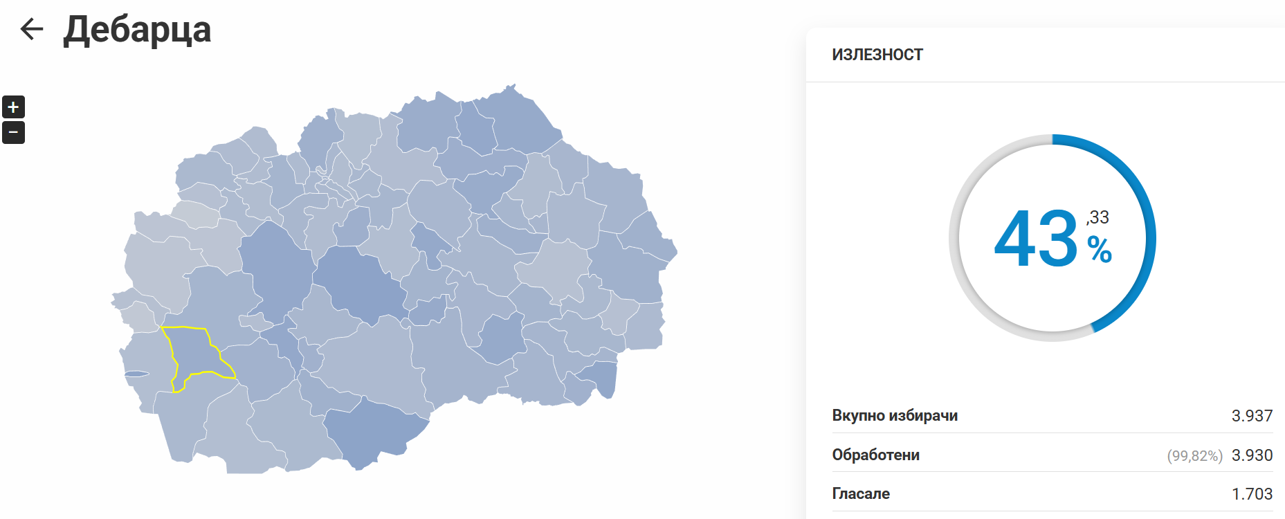 Што се однесува до излезноста во Дебрца до 15 часот своето право на глас го оствариле 1 703 гласачи од запишаните 3 937 во Избирачкиот список или 43,33%.