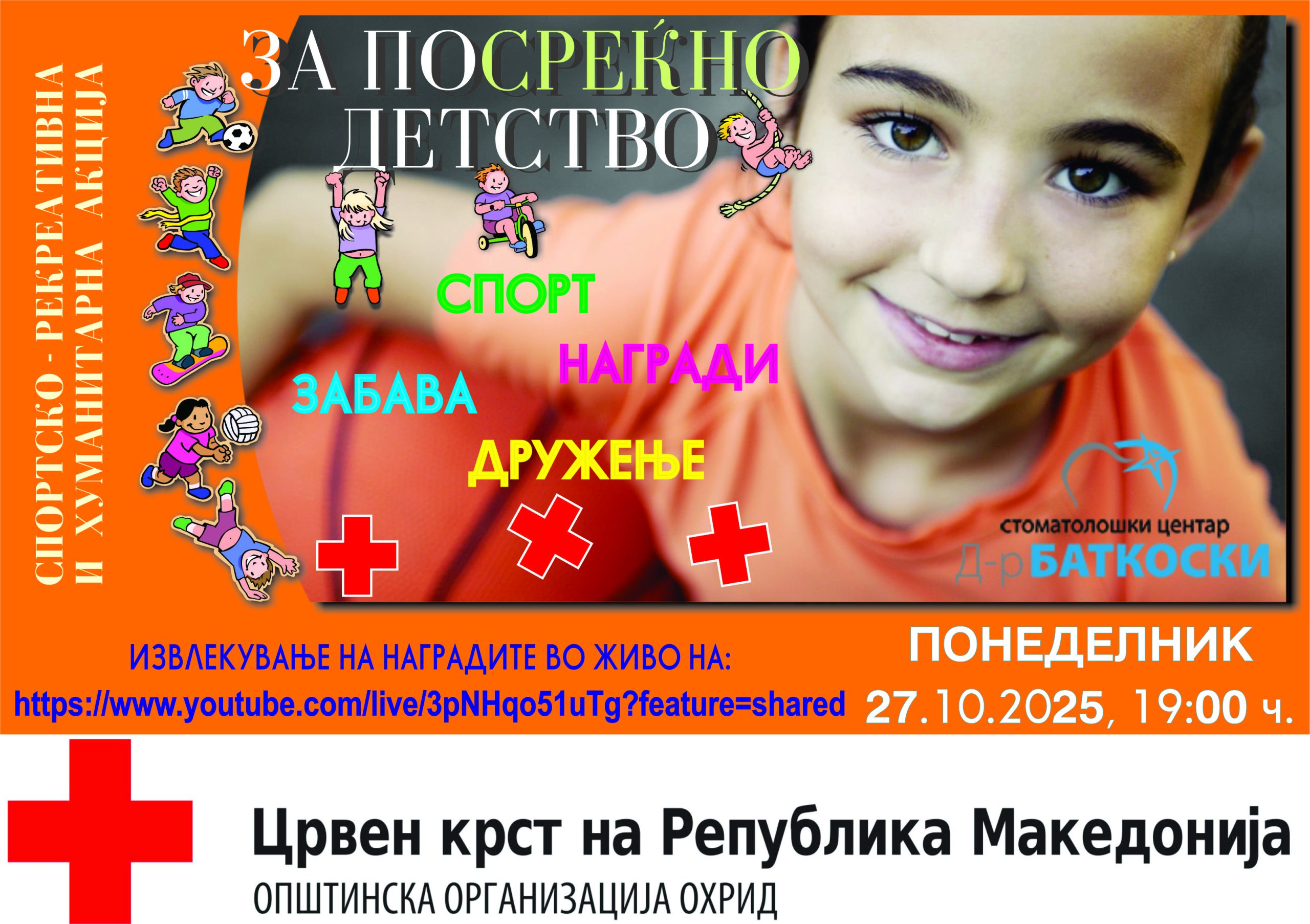 Извлекувањето на добитниците на 30 вредни награди од овогодинешната хуманитарна и спортско-рекреативна акција на Црвен крст Охрид „ЗА ПОСРЕЌНО ДЕТСТВО“ ќе се изврши во понеделник, 27 октомври, во 19 часот.