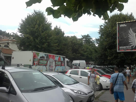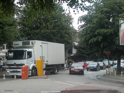 Камиони кои ги снабдуваат продавниците или угоистителските објекти и службени возила на јавните претпријатија се движат во центарот на градот во време на шпиц, со што предизвикуваат застој, колони и нервоза кај возачите. Една таква слика затекнавме деновиве во центарот каде поради променливото време е зголемена фрекфенцијата на сообраќај. Неколку камиони заглавија помеѓу автомобилите поради што се создаде колона речиси по целиот тек на улицата „Македонски просветители“.