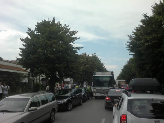 Камиони кои ги снабдуваат продавниците или угоистителските објекти и службени возила на јавните претпријатија се движат во центарот на градот во време на шпиц, со што предизвикуваат застој, колони и нервоза кај возачите. Една таква слика затекнавме деновиве во центарот каде поради променливото време е зголемена фрекфенцијата на сообраќај. Неколку камиони заглавија помеѓу автомобилите поради што се создаде колона речиси по целиот тек на улицата „Македонски просветители“.