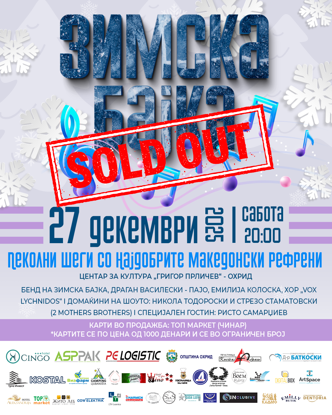 Нема повеќе карти за шоуто „Зимска бајка“ што ќе се случи на 27 декември во центарот за култура „Григор Прличев“ со почеток во 20 часот, соопшти организаторот.
