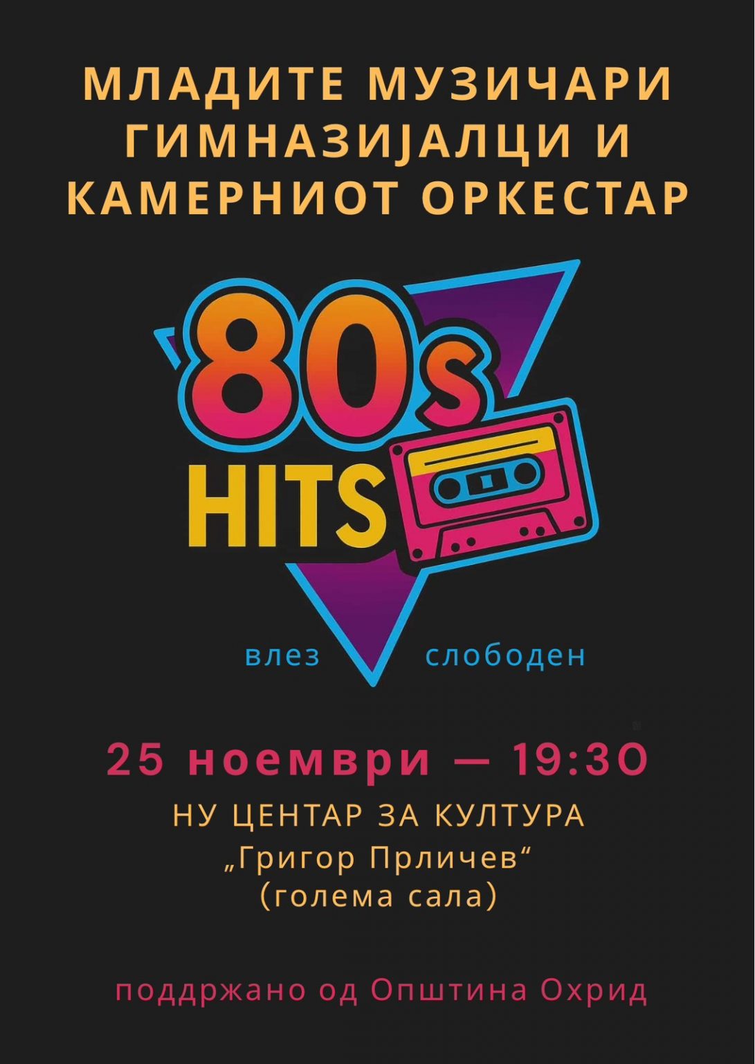 Учениците од охридската Гимназија утре ќе одржат концерт со камерен оркестар во НУ Центар за култура „Григор Прличев” – Охрид. На репертоарот се хитови од осумдесетите.