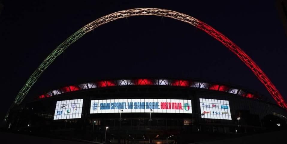 Да течеше животот според планот во Европа, вчера, на Вембли стадионот силите во контролен натпревар ќе ги одмераа селекциите на Англија и Италија. Но коронавирусот ја „нападна“ Европа, го стопираше животот и го прекина спортот. Англичаните во знак на поддршка го обоија легендарниот стадион „Вембли“ во боите на Италија.