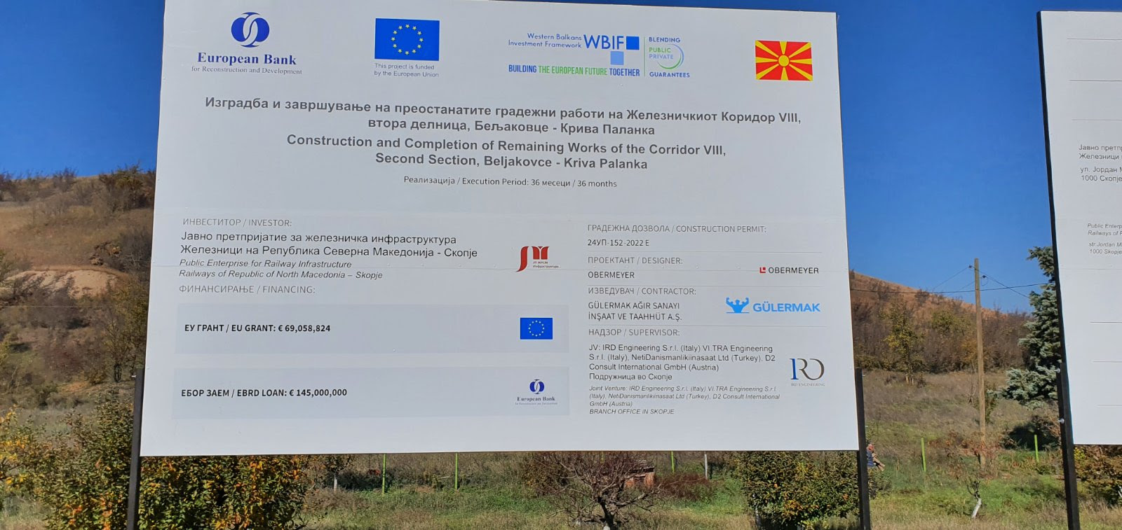 Делницата Бељаковце – Крива Паланка се гради со финансиска помош на ЕУ обезбедена преку Инвестициската рамка за Западен Балкан (ВБИФ). Грантот финансиран од ЕУ-ВБИФ од 75 милиони евра, дополнет со национален придонес од 1 милион евра, е доделен за да се доближи овој железнички дел до современите стандарди. Работите ќе се изведуваат од октомври 2022 година до крајот на 2025 година и опфаќаат тунели во должина од 5,5 километри, железнички мостови, над и подвозници, железнички станици и стојалишта, како и нов систем за сигнализација и телекомуникација. Дополнителен грант финансиран од ЕУ од 210 милиони евра е во план за завршување на источниот крај на железничкиот Коридор 8 до границата со Бугарија, информираше Канцеларијата на ЕУ во Скопје во пресрет на денешните активности.