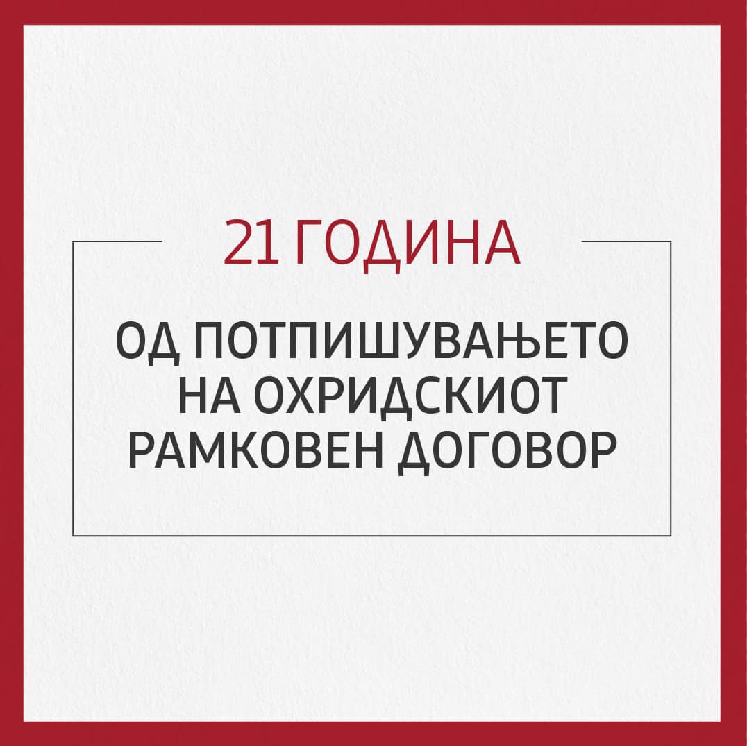 Република Северна Македонија низ годините покажа дека успешно гради заедничка иднина за сите граѓани подеднакво. Ние сме мултикултурна, мултиетничка функционална демократија, земја на пријателства, соживот и заедништво. Тоа е нашата сила, нашиот темел за развивање на држава со еднакви услови за сите Македонци, Албанци, Турци, Срби, Власи, Роми, Бошњаци и сите други заедници кои оваа земја ја сметаат за свој дом, напиша премиерот Димитар Ковачевски на Фејсбук по повод 21 година од потпишувањето на Охридскиот рамковен договор.