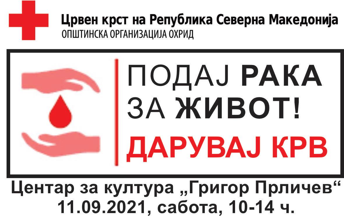 Поради зголемените потреби од крв и крвни продукти за пациентите во здравствените установи во Охрид, Црвен крст Охрид организира крводарителска акција која ќе се реализира на 11.09.2021 (сабота) во просториите на НУ Центар за култура „Григор Прличев“ .