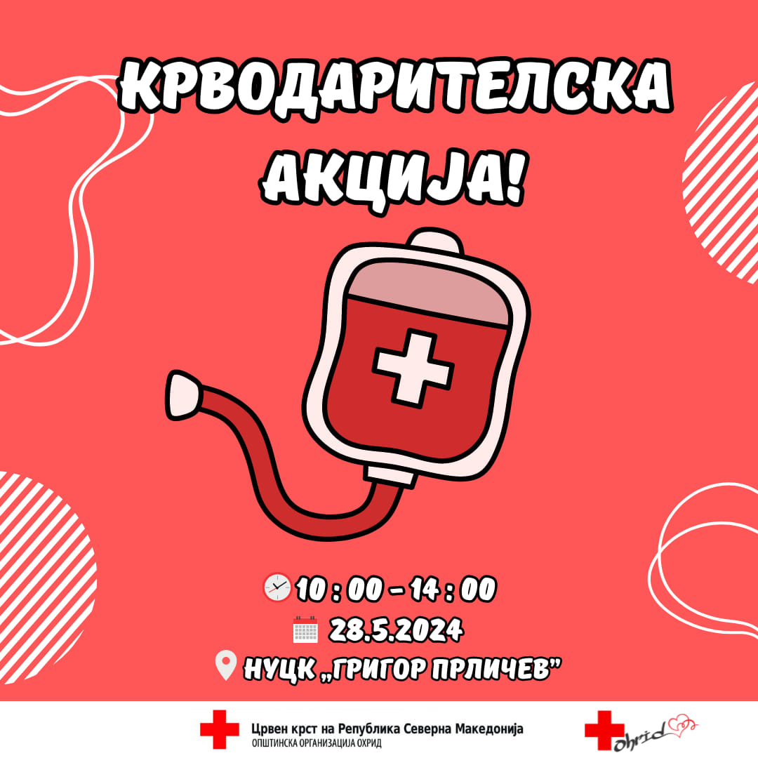 Ги покануваме сите граѓани да ја искажат својата хуманост на оваа крводарителска акција, да ја донираат својта скапоцена течност и да спасат нечиј живот, порачуваат од Црвен крст Охрид.