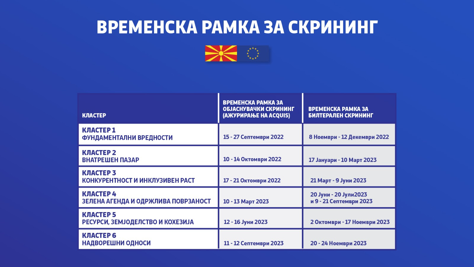Според Маричиќ, скринингот по кластери и поглавја официјално почнува на 15 септември и тој ќе се спроведува истовремено и за нашата земја и за Албанија. Очекува скринингот да заврши за најмногу 16 месеци. Тоа, како што рече, се должи на фактот што земјава веќе во 2018 и 2019 година помина една фаза на објаснувачки и подготвителни состаноци за сите 33 поглавја пред да се објави новата методологија за проширување на Унијата, што е наша предност. Во овој период, прецизира, Европската комисија и презентираше преку 8.000 ЕУ акти. Во тоа беа вклучени околу 2.000 наши државни служебници во сите 33 поглавја.
