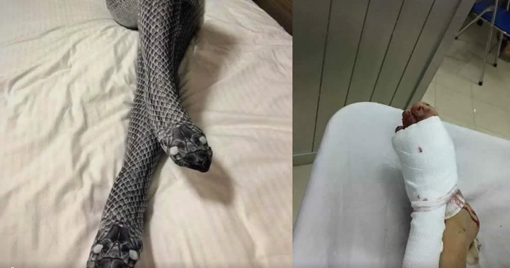 Кога сфатил дека змијата всушност е стапалато на сопругата, веќе било предоцна, па жената завршила во болница со скршеници. Фотографиите на змиските чорапи и скршената нога станаа вирални на интернет.