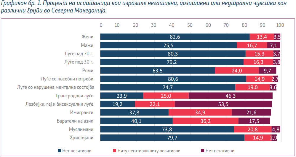 Од друга страна, 53,5 проценти од граѓаните отворено ги искажуваат своите негативни чувства или предрасуди кон лезбијките, геј и бисексуалните лица, а нешто помал е процентот од 46,3 отсто на оние кои изразуваат негативни чувства кон трансродовите лица или имигрантите – 21,6 проценти.