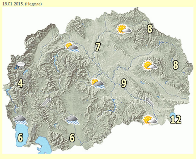 Денеска во земјава ќе преовладува променливо облачно и релативно топло време, попладне со повремен локален дожд, особено во западните делови. Ќе дува слаб ветер од јужен правец. Во Охрид слично време, со максимална дневна температура до 6 степени Целзиусови, информираат од УХМР Македонија.