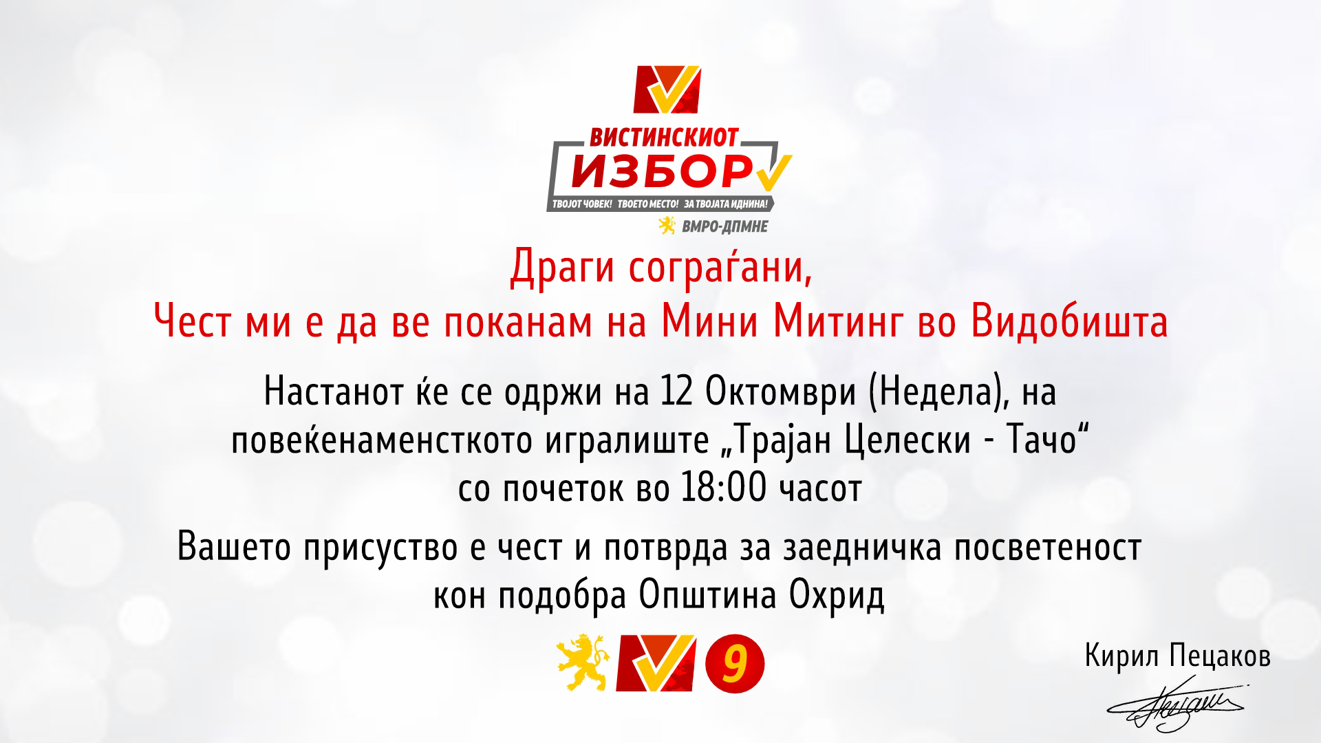 Со почеток во 18 часот на спортскоТО игралиште „Трајан Целески – Тачо“, ќе се одржи мини митинг, на кој ќе биде претставена програмата на Пецаков кој ја бара довербата од граѓаните за втор мандат.