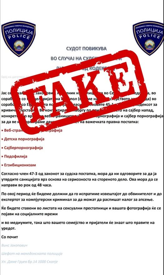 Министерството за внатрешни работи ја известува јавноста дека до неколку граѓани и правни лица, од страна на сторители кои лажно се претставуваат во име на МВР и ЕВРОПОЛ, се упатени лажни покани во врска со наводна тековна истрага. Апелираме до граѓаните да не наседнуваат на ваквите измами, а Секторот за компјутерски криминал при МВР веќе презема соодветни мерки и активности за законско санкционирање на сторителите, информира МВР.