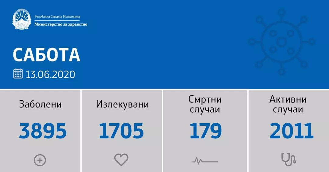 Вкупната бројка на ковид дијагностицирани во нашата земја од почетокот на епидемијата изнесува 3895, бројката на оздравени пациенти е 1705, на починати е 179, а во моментов бројот на активни случаи во земјата изнесува 2011, соопшти Министерството за здравство.