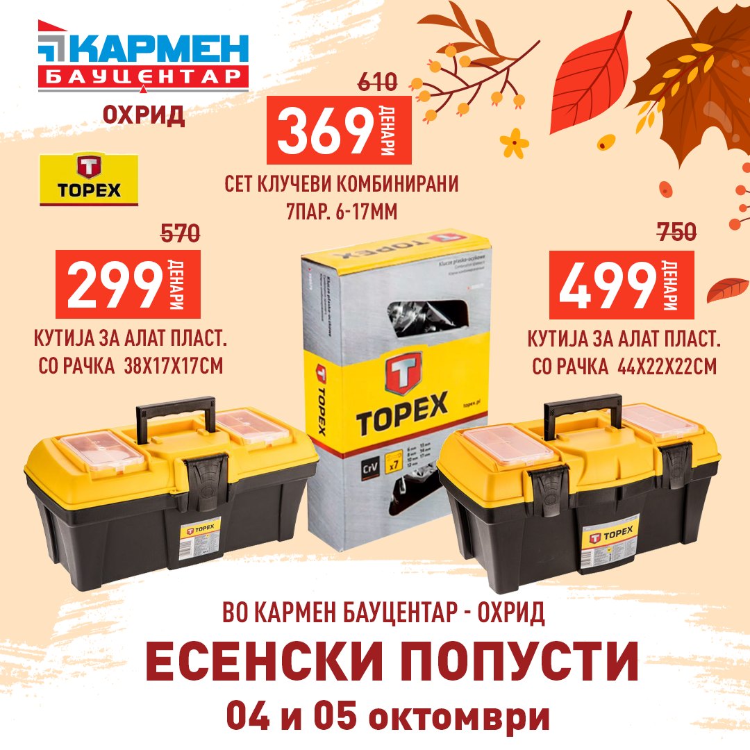 Не пропуштајте ја оваа единствена есенска прилика каде ќе има широка понуда на висококвалитетни производи и алатки од светски познатите брендови Clever, Marazzi, Verto, Bosch, Mapei, Annovi Reverberi, GTX, Neo Tools, Swiss Krono, Graphite, Stanley, Soudal, Topex и уште многу други со попусти почнувајќи од 15% па се до 60%.