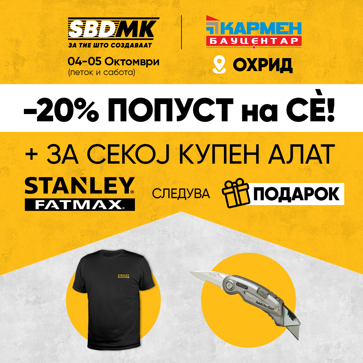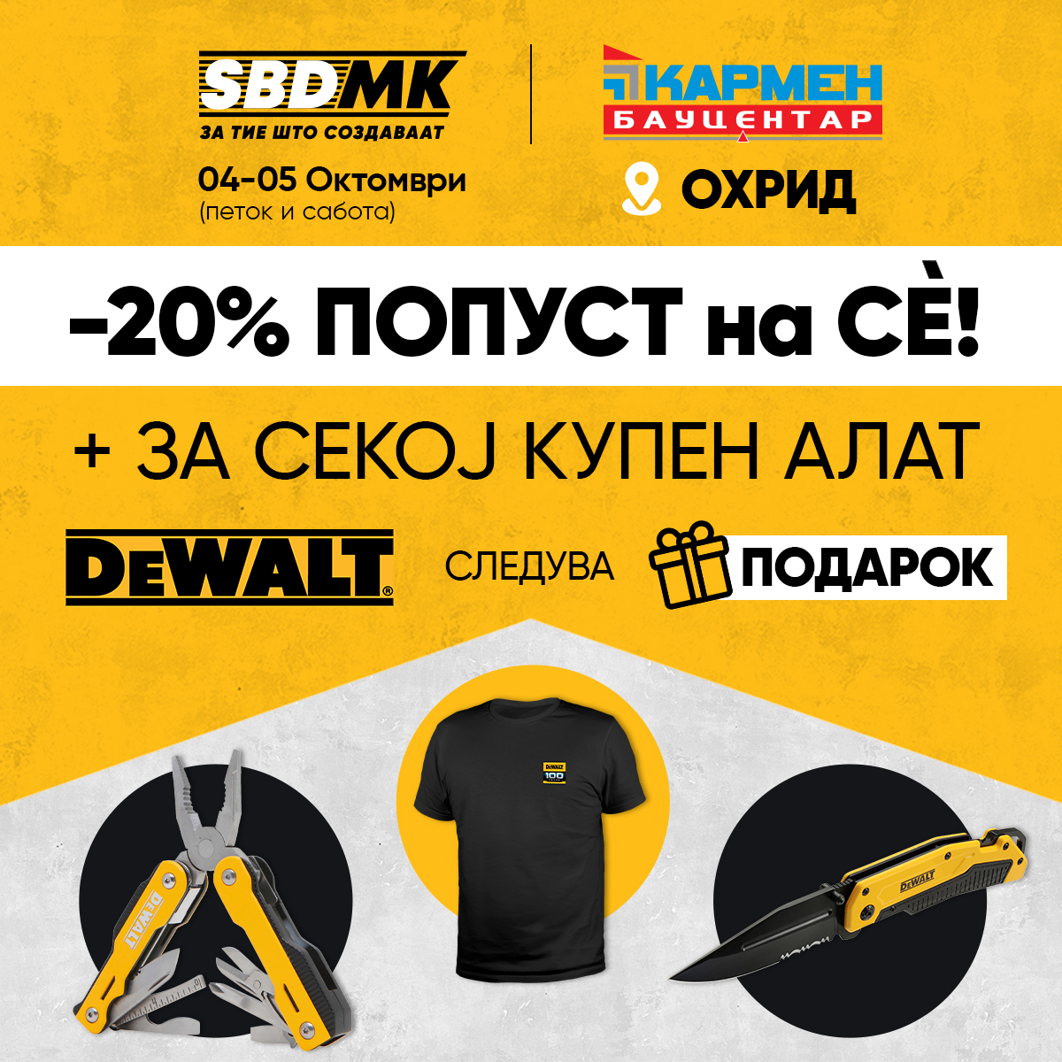 Следат и 20% попуст на производите од брендот DeWALT и Stanley FATMAX, и дополнително – специјални подароци за секој купен батериски или електричен алат од DeWALT и Stanley FATMAX.