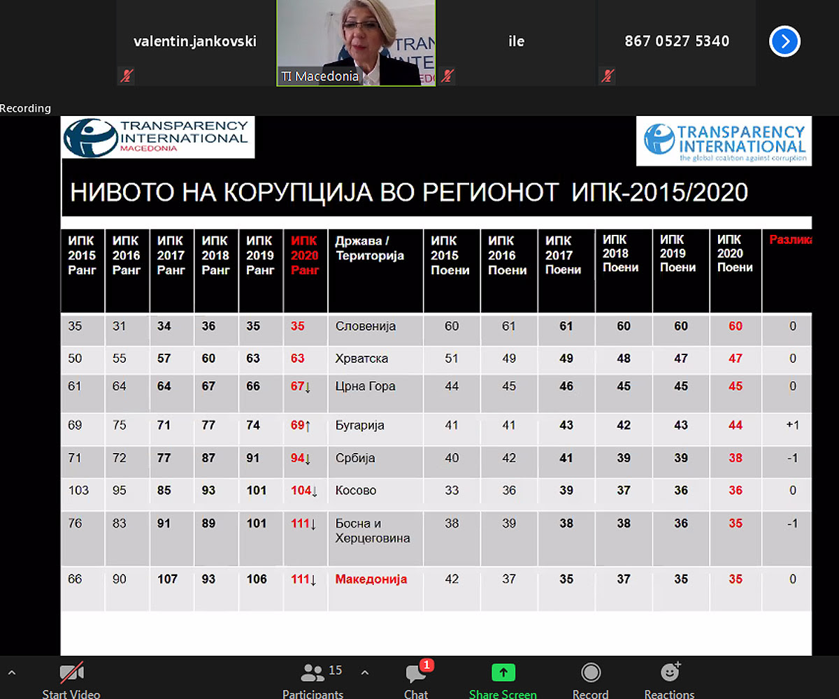 Во 2014 година сме биле рангирани на 64-тата позиција со 45 поени, а оттогаш наваму се бележи постојан пад. Најголемиот пад го имавме во 2017 година кога од 90-то се симнавме на 107-мо место. Лани бевме на 106-то, а сега сме на 111-то место. Бројот на индексни поени не е променет што покажува дека не се постигнуваат резултати во областите кои се содржина на истражувањата кои се користени за анализа на податоците за Република Северна Македонија, но имаме намалување во клучните области – владеење на правото и човековите слободи и права. Носителите на власта треба да сфатат дека со декларативно изразена политичка волја за борба против корупцијата, а без јасно изразени и видливи активности, резултати и ефекти од таа борба и понатаму ќе имаме резултати кои ќе укажуваат на многу висок степен на корупција. Неопходно е многу сериозно да се зафатиме со ефикасна и вистинска борба против корупцијата зашто политичките декларации не покажаа резултати, рече Тасева и додаде дека е очигледно дека само со политика и декларативност не може да се промени состојбата.
