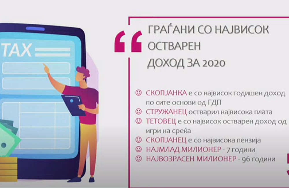 Во 2020 година скопјанка остварила најголем годишен доход по сите основи од годишната даночна пријава од 453,1 милиони денари што е двојно повеќе од најголемиот остварен годишен бруто доход во 2019 година. Највисока плата имал стружанец, тетовец имал најголем доход од игри на среќа, скопјанец најголема пензија, а најмладиот и најстариот милионер со доход остварен од закупнина се на возраст од седум и 96 години, покажуваат податоците од Управата за јавни приходи кој денес на прес-конференција ги истакна директорката Сања Лукаревска.