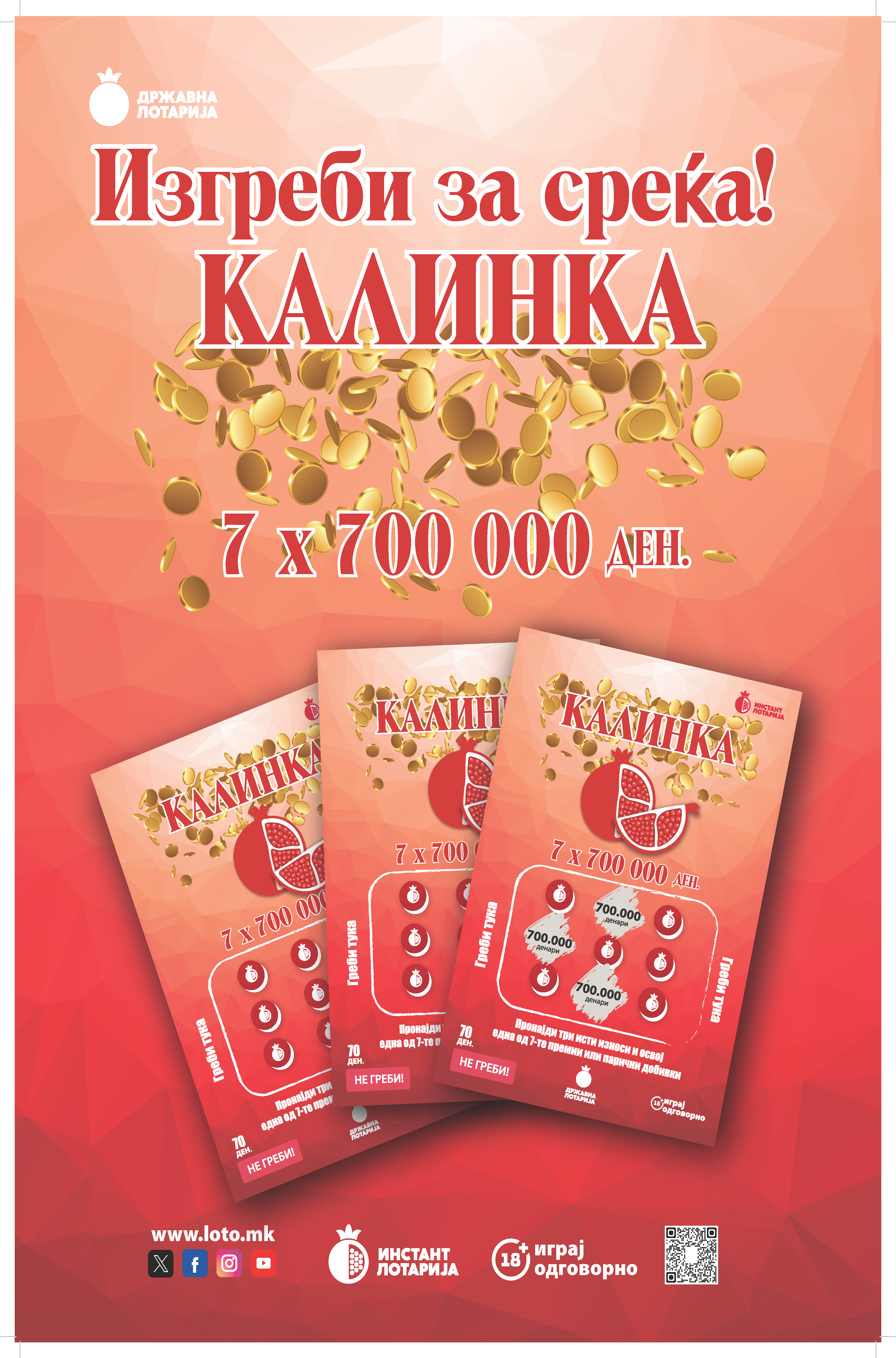 Списокот членови на семејството на инстант лотаријата го завршуваме со инстант лозот, којшто го носи традиционалниот симбол на семејна среќа и благосостојба и веќе препознатлив и како симбол на Државна лотарија ‒ „Калинка“. Овој инстант лоз со 7-те премии од по 700.000 денари е шармантен и забавен, а познат е по својата убава симболика и примамлив изглед.